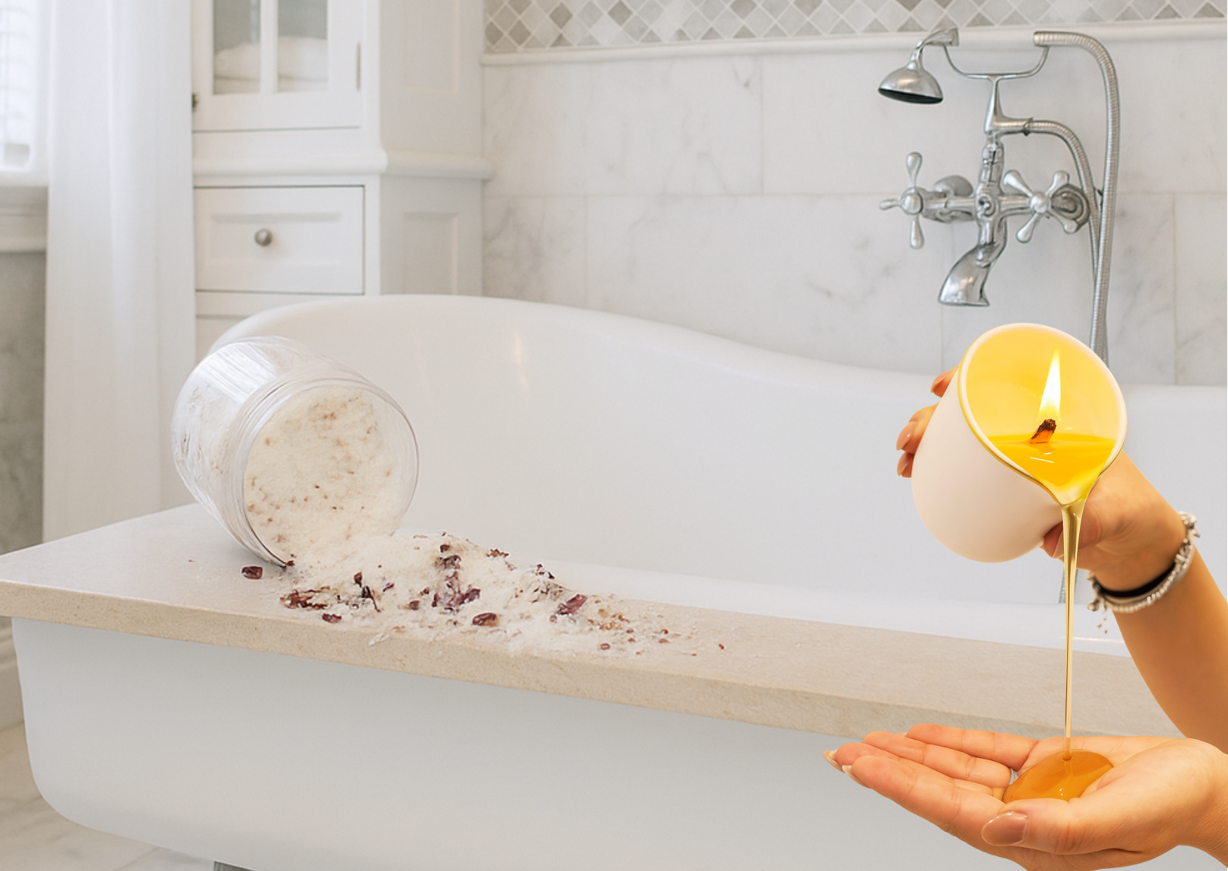 Our handcrafted bath salts and massage candles are designed to turn your daily routine into a calming ritual. Made with premium ingredients and enriched with skin-loving minerals, each soak soothes the body, nourishes the skin, and fills your space with beautiful, relaxing aromas. Whether you're unwinding after a long day or treating yourself to a quiet moment of peace, our bath essentials invite you to slow down, breathe deeply, and enjoy the luxury you deserve.